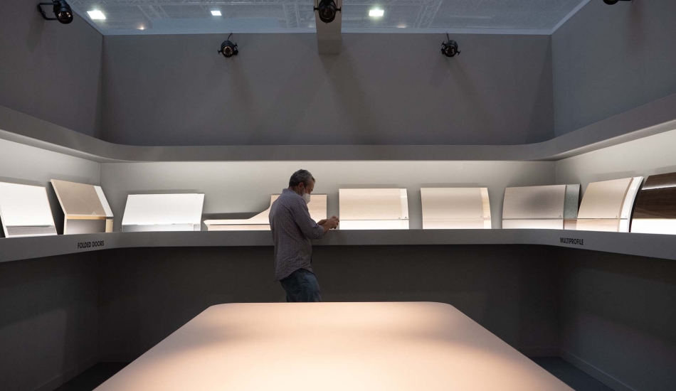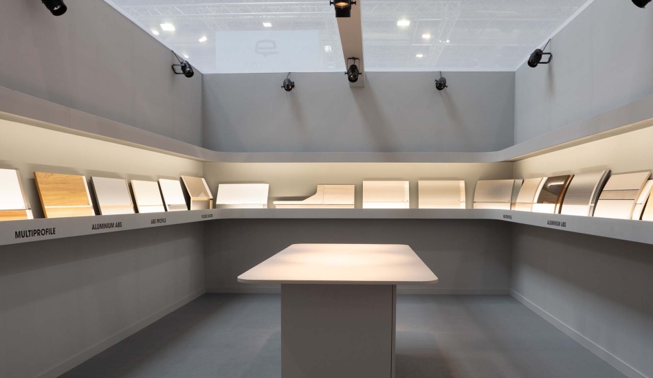 Le stand est aménagé comme une "gallery collection" et, comme de vraies stars, dans la salle d'exposition, tous les projecteurs sont braqués sur les battants et les plans de travail. Vous pouvez y toucher et comparer les produits, en percevant leur forme, leur légèreté, leurs détails raffinés et leurs décorations. Nous suggérons ici des idées et des tendances aux concepteurs et aux designers.