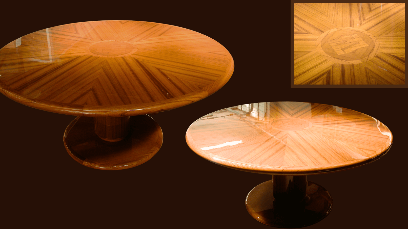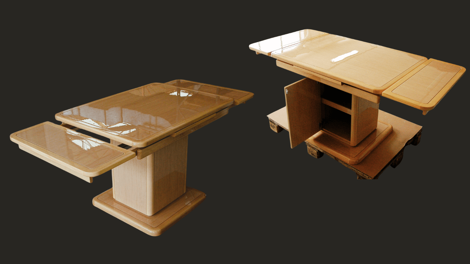 The products crafted include tables (both for indoor and outdoor use), doors, staircases, and complete furniture sets for any space. Tables are shaped in a variety of forms and can feature refined inlays. Upon request, outdoor tables can be made from teak wood. The main materials used are a combination of natural veneer, HPL, and lacquered finishes. A distinctive element of this type of furnishing is the use of rounded, welcoming solid wood elements, combining strong visual appeal with ergonomic excellence.